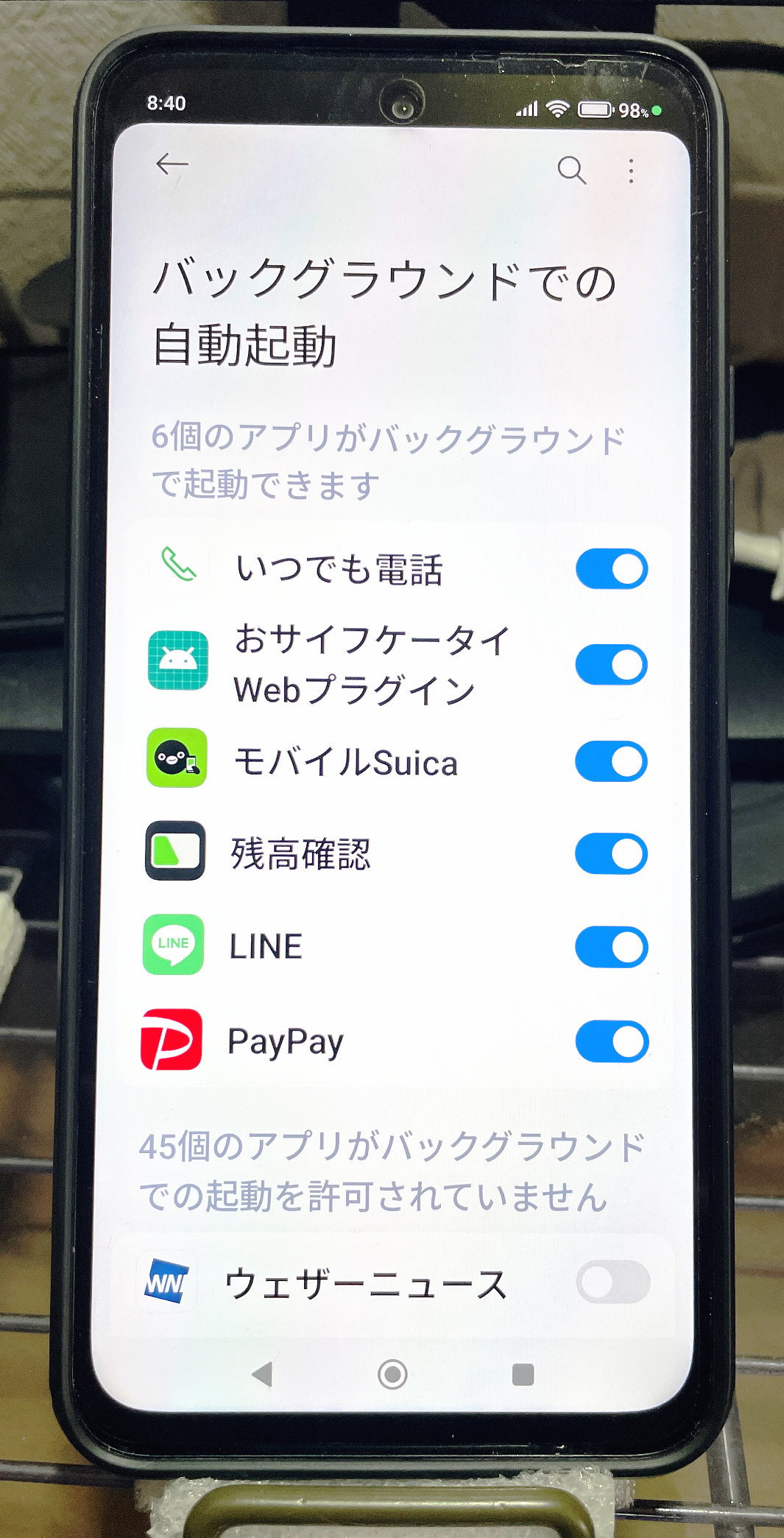 まずはバックグラウンドでの自動起動アプリをオフにします。必要なものとよく使うものだけをオンにしておきます。