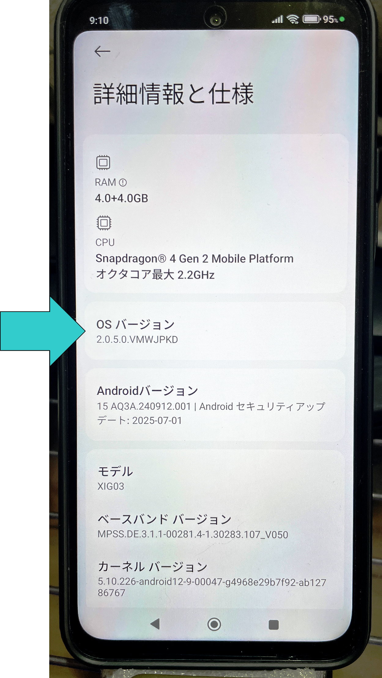 Xiaomi Redmiの場合はOSバージョンを7回タップして表示させます。