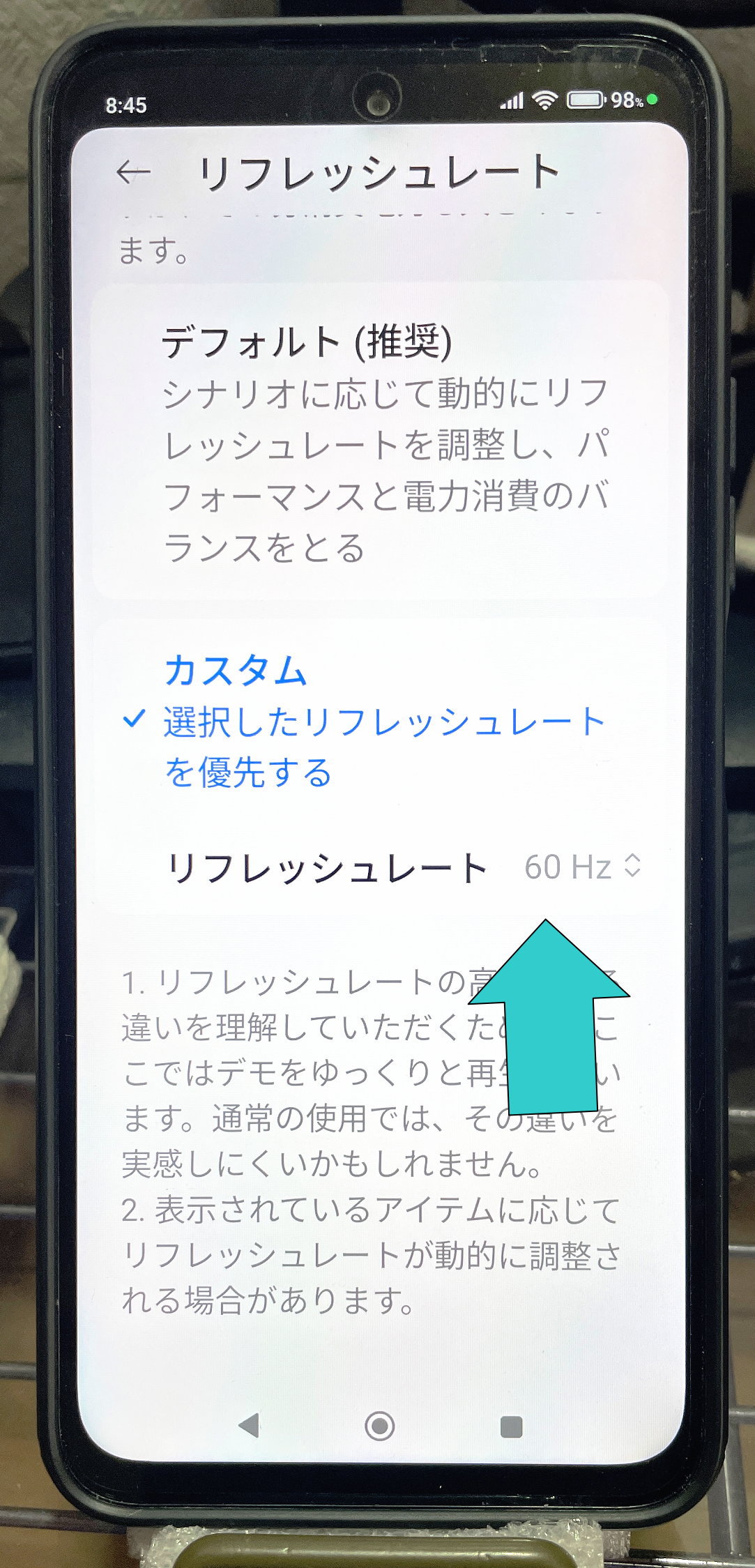 ↓ 設定→ディスプレイと明るさ→リフレッシュレートで、自動からカスタムの60Hzにします。