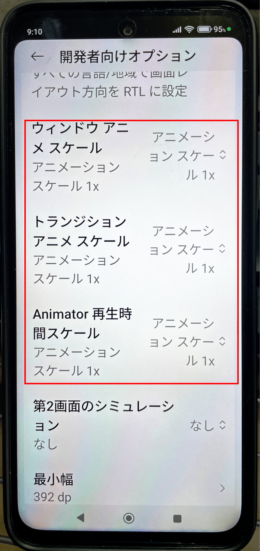 さらに追加設定にある「開発者向けオプション」を有効にして各種アニメーション動作をオフにしてみます。