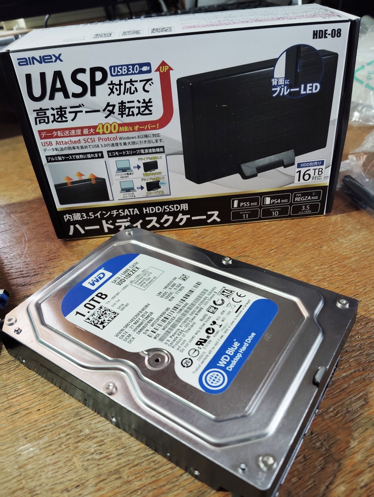 Amazonで以前も買ったことのあるAinexのHDE-08というのを注文して、ハードディスクはウェスタンデジタル社の1TBを手配しました。