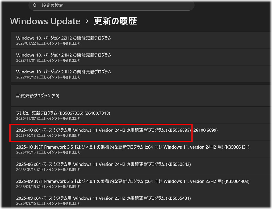なので更新プログラムの履歴を調べてみるとたしかに10/15日に KB5066835が入っていて、キーボード不具合に気づいたのが10/18日で、その後11/7日に次の更新があった後に直っていますわ。