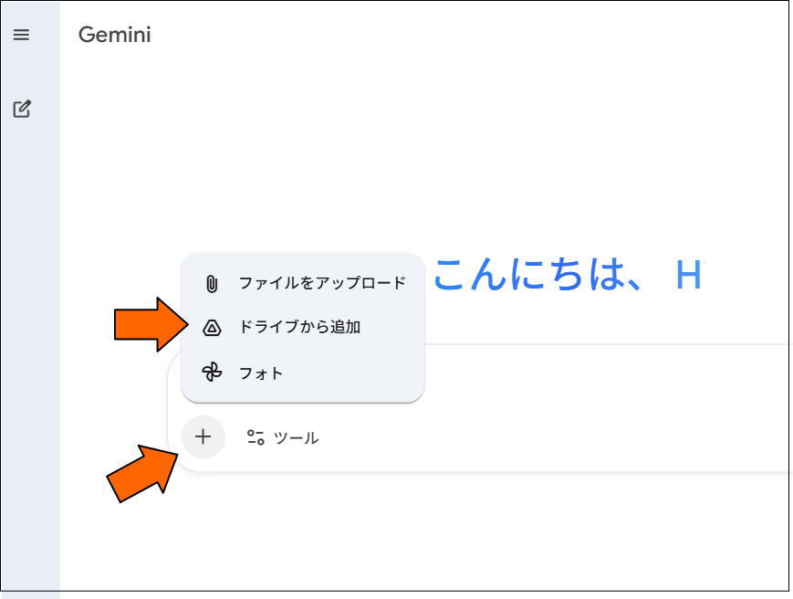 「Geminiに相談」という画面になるので、プラスマークをクリックしさきほどの音声ファイルを指定します。