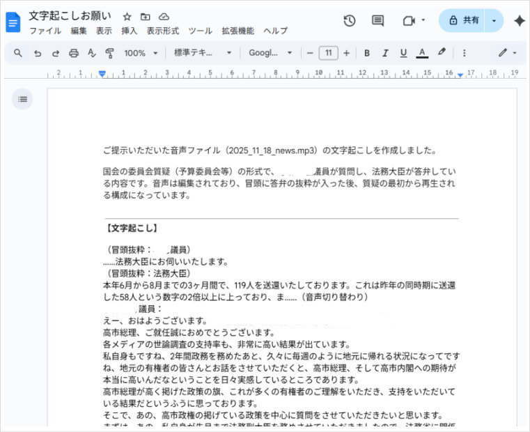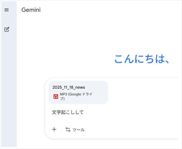 取り込んだMP3ファイルをGeminiが認識したら、次に「文字起こしして」とかキーボードで打ってGeminiに指示します。