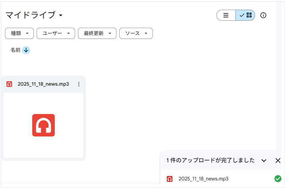 ↓ グーグルドライブにアップしたMP3ファイルが確認できます。(これは再現したものです)