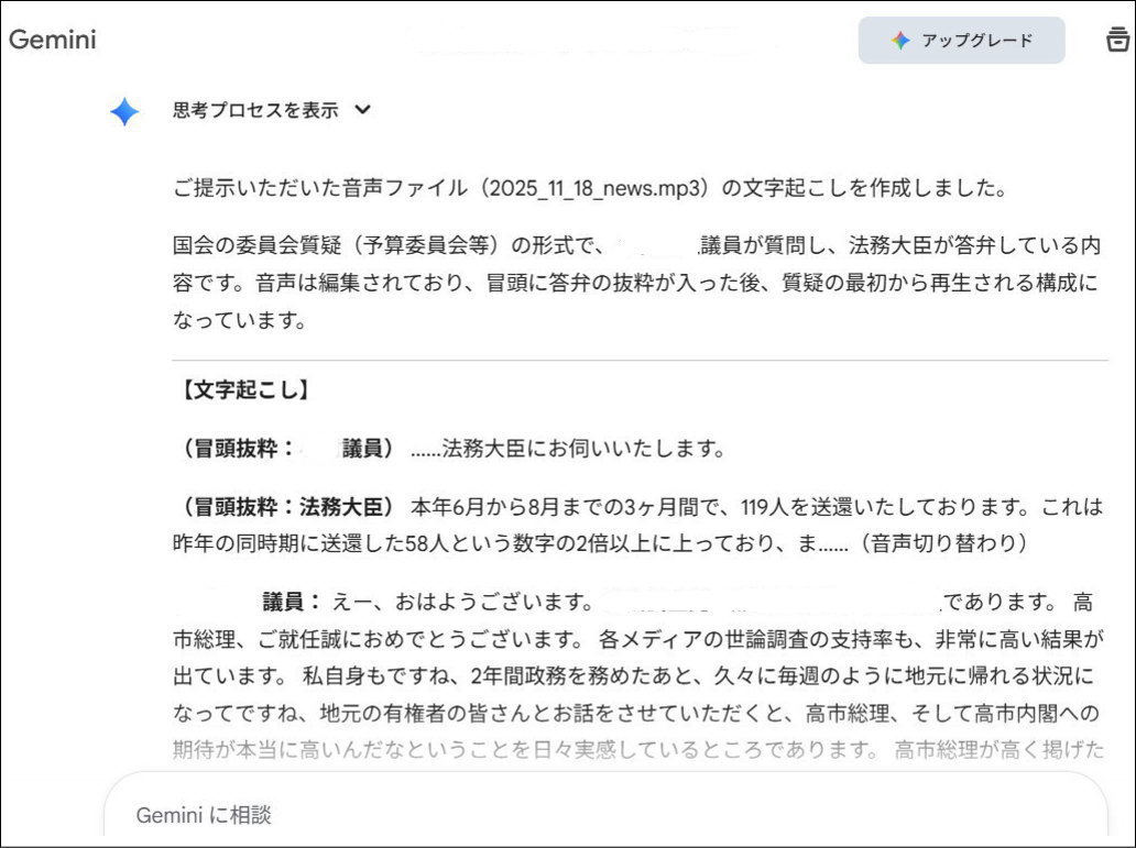 しかし、Geminiでの音声ファイルからの文字起こしはメチャ正確であります。さすが2025年現在で最先端と言われる性能のAIですな。