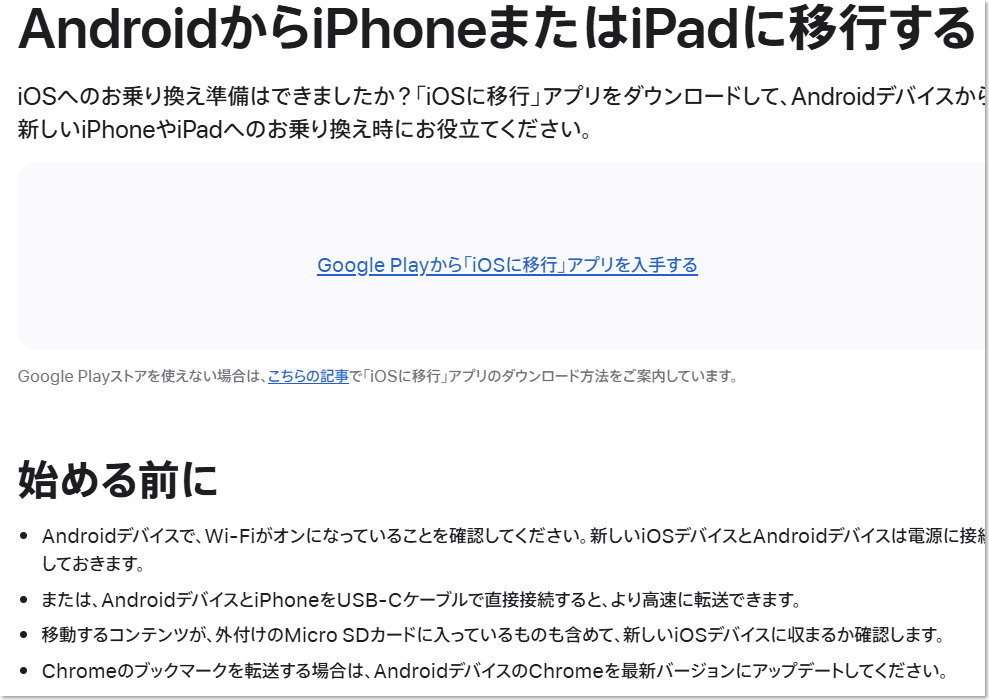 ということでなるべく簡単に行うために一旦iPhoneのほうを初期化してから行うことにします。やり方は「AndroidからiPhoneに移行する」とググるとアップルのサイトにそのやり方が案内ページがあります。