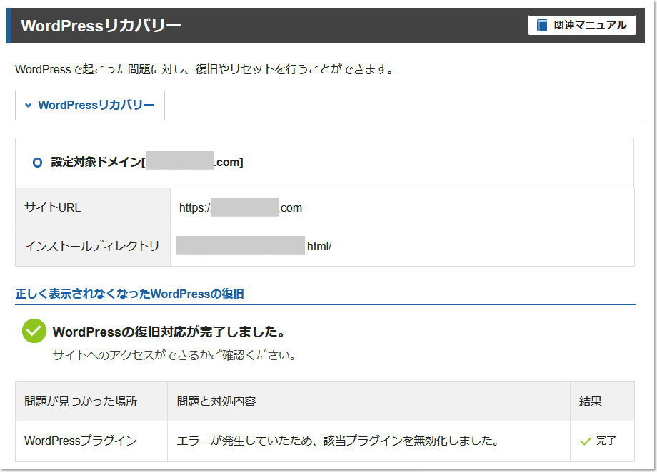 オーナーに聞いたログインデータでXServerにログインし、その「WordPressリカバリー」を適用します。すると15分くらいで結果が出たらしく完了との表示が出ました。