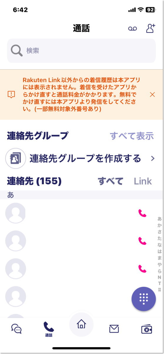 まあさっそくそのオヤジにRakuten Linkから試しで電話を掛けてみます。連絡先を読み込んでくれるのでその一覧から選んで発信します。そしてとくに問題もなく通話できたし音声の品質もキレイですな。