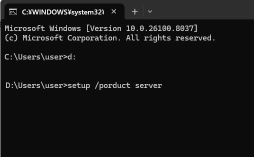 そんでなんなくWindows 10が入ってプロダクトキーも認証されたので、次はWindows 11を例のサーバーとしてインストールで入れてみます。インストーラーの入ったUSBを差し込んでからドライブレターを確認して例のコマンドを打ちます。