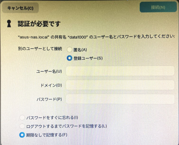 と入力し「接続」ボタンを押します。次に資格情報の入力で「認証が必要です」と出るので、NASに設定したログイン許可したユーザー名とドメインとパスワードを入れます。ドメインはもともと独自に設定していなければ「WORKGROUP」でも大丈夫です。